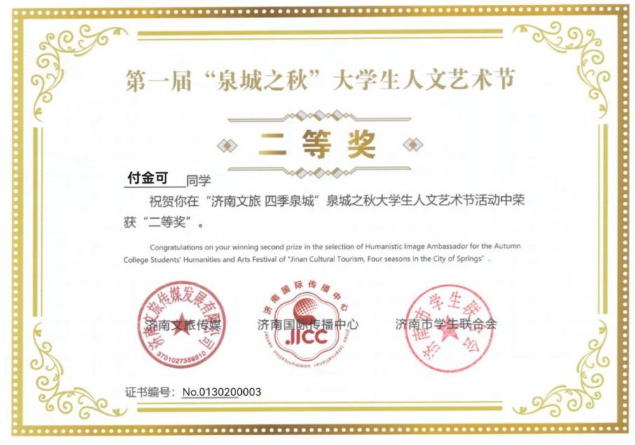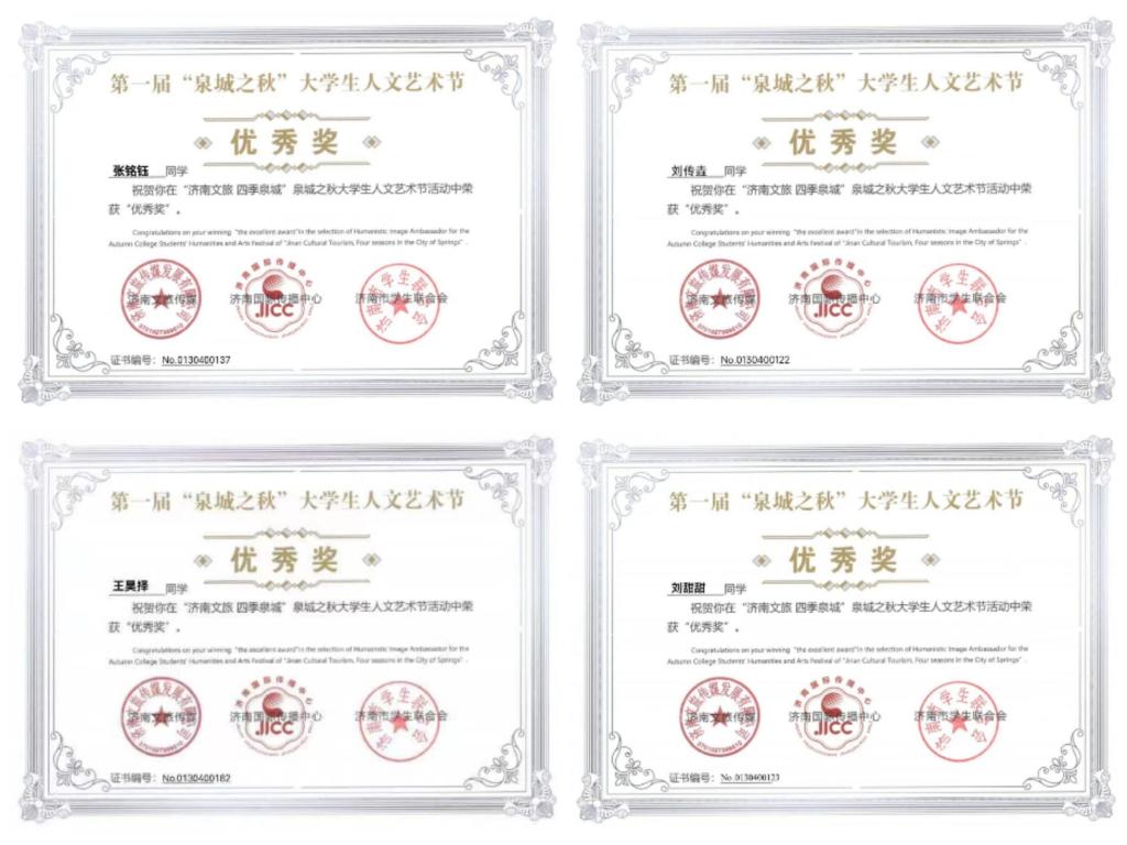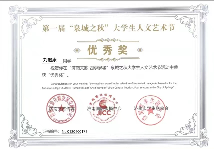 2023年4月12日,生命科学学院6名学生在济南市委宣传部、济南市文化和旅游局指导,济南文旅集团、济南国际传播中心、济南市学生联合会联合主办的第一届“泉城之秋”大学生人文艺术节比赛中荣获佳绩。付金可荣获大赛二等奖,刘甜甜、张铭钰、刘继康、刘传壵、王昊择荣获大赛优秀奖。