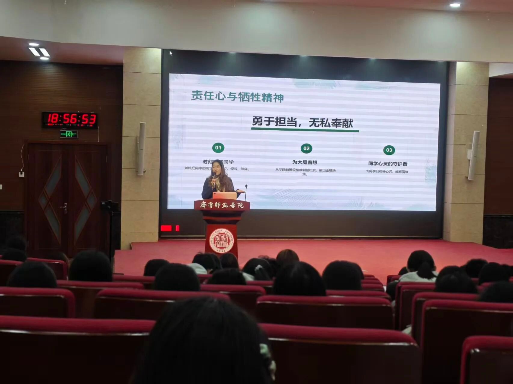 本年度心理委员暨青春健康同伴员培训采用线下线上结合的形式开展,培训持续1个月。线下培训会上,黄玫围绕“心理委员的核心素养与领导力提升”这一主题展开深入讲解。首先引导同学们明晰任职初心,阐释心理委员在班级工作中所承担的多重身份角色。针对素养要求,重点讲解了大学生常见心理问题的识别与应对技巧,强调需兼具共情力、观察力与沟通力,并恪守“保密优先,生命至上”原则,践行“助人自助”的服务理念。讲座内容详实,案例生动,现场气氛专注而热烈。