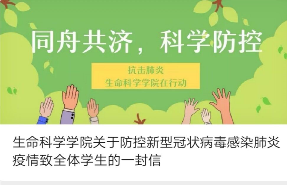 自疫情发生后,生科院学生党支部号召全体学生党员深入贯彻学习习总书记坚定信心、同舟共济、科学防治、精准施策的总要求,学生党支部书记张宏熙老师牵头发出了《生命科学学院关于防控新型冠状病毒感染肺炎疫情致全体学生的一封信》,热情洋溢, 鼓舞士气,又充满真情关切,号召全体生科学子认真学习掌握新型冠状病毒感染肺炎的相关预防知识及注意事项,切实增强防范意识;面对疫情,要保持理性思考,不信谣、不传谣,尽己所能,用实际行动维护大局,弘扬青春正能量,做新时代具有远大理想和责任意识的爱国者;号召各位学生党员及学生干部要积极投身于积极防控之中,发挥先锋模范作用。