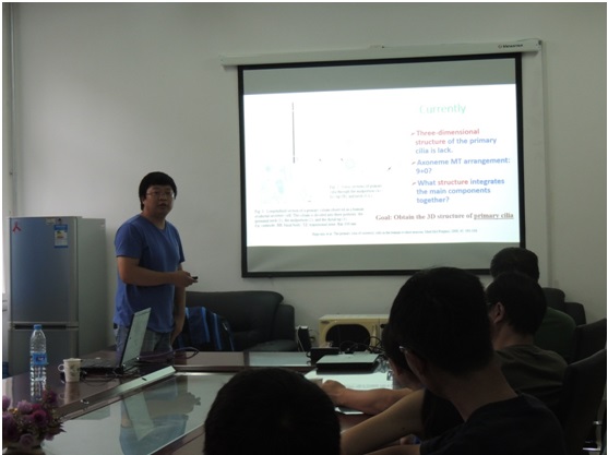 孙书锋博士的研究领域为结构生物学。在题为“Three-dimensional structure of primary cilia in kidney cells”的报告中,孙博士详细介绍了肾脏原纤毛的三维结构:9条微管在原纤毛基部往上伸展、并逐个到达各自的顶端,形成纵向上高低参次的形态,由此决定了原纤毛的直径由基部到顶端逐渐变细,可能对维持原纤毛的稳固性起着重要作用。其研究结果可能形成对微管“9+2”或“9+0”模式的新的认知。此外,孙博士还分享了在样本制备、电镜扫描、计算等过程中出现的问题及解决方案。孙书锋博士的报告深入浅出、条理清晰,并提供了自身的研究历程、研究心得,在座的老师和同学们都受益匪浅。最后老师和同学们对报告中的疑问进行了提问,大家展开了深入的讨论。