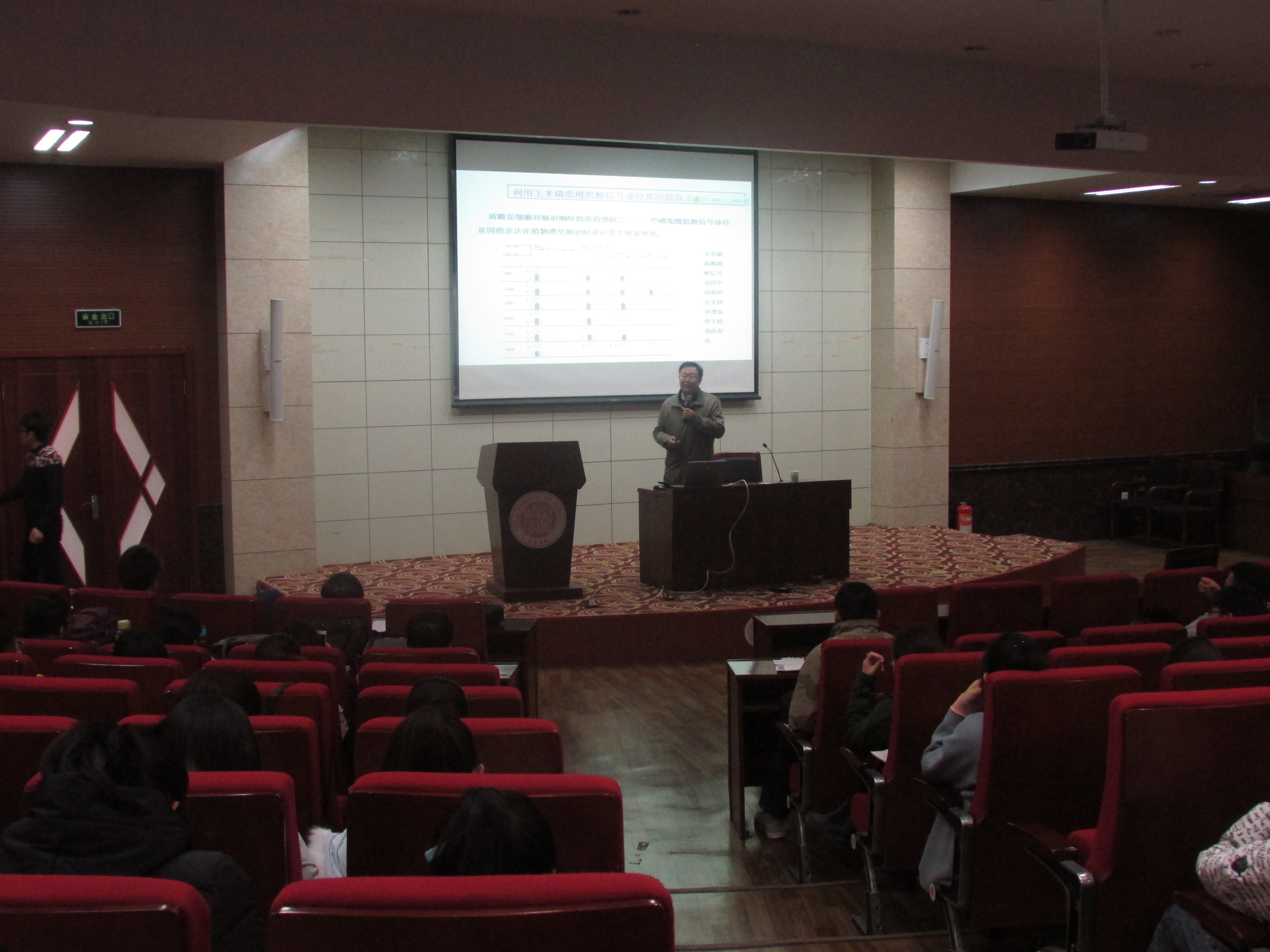 报告会上,张教授首先讲了玉米转基因育种的历史、路线、发展前景,包括目的基因的选择、基因表达载体的构建等内容。其次,通过数据展示、数形结合的方法阐明了玉米转基因育种的优势及前景。最后,张教授与学生们交流了关于学术问题研究过程的心得体会。