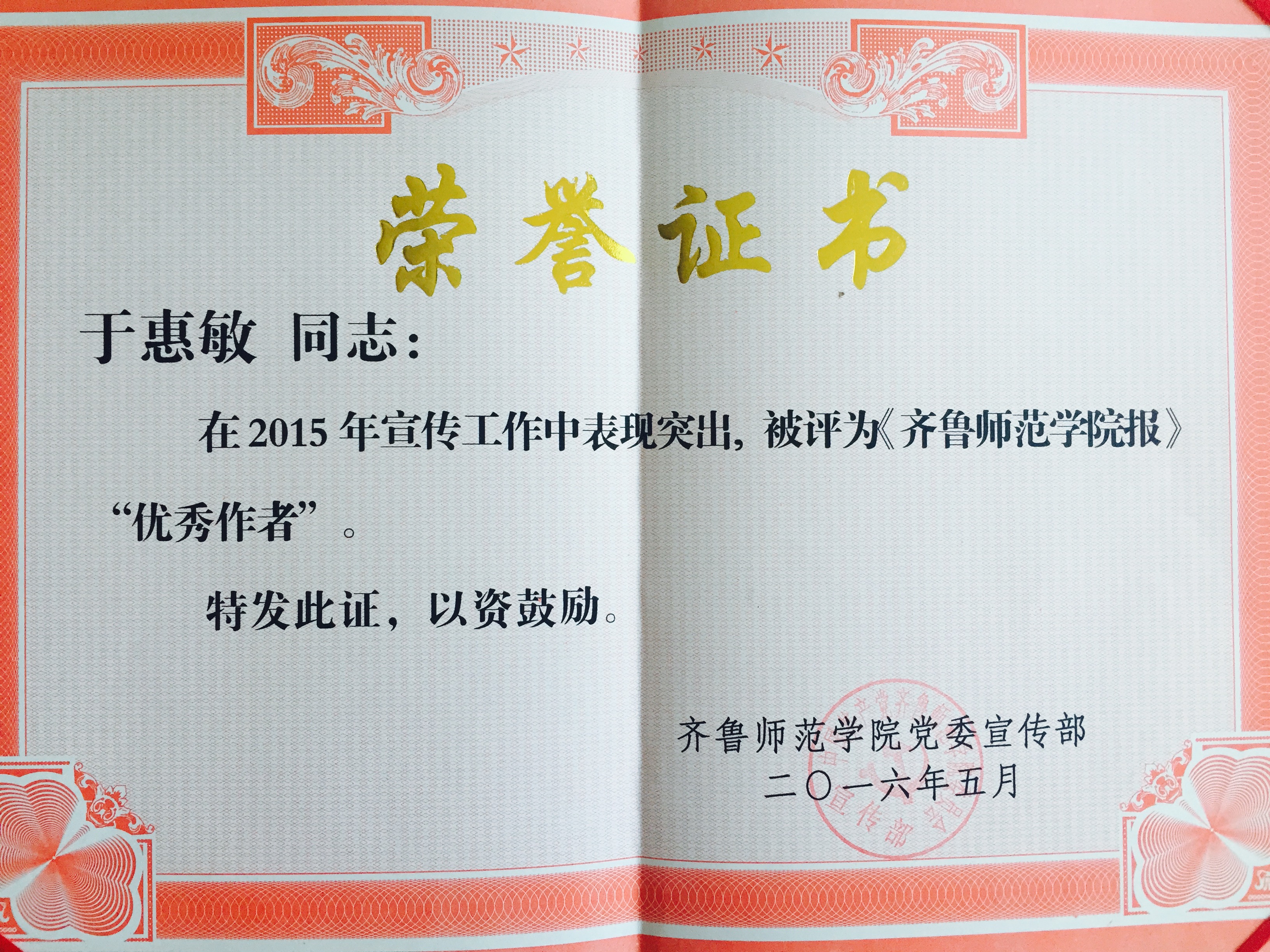 于惠敏获2015年“齐鲁师范学院报”优秀作者