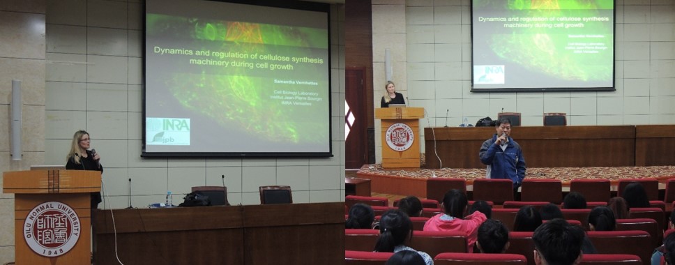 报告会上,Samantha Vernhettes教授介绍了植物细胞壁合成酶编码基因CesA基因家族的研究进展;随后,结合本实验室的研究工作,Vernhettes教授阐述了CesA蛋白在细胞内的定位及动态行为、微管蛋白与CesA蛋白的功能关系、微管的排列方向与细胞生长的关系;最后,Vernhettes教授介绍了影响细胞骨架行为的药物筛选方面的一些最新进展。教授的英语生动形象,容易理解,使同学们对教授的报告和研究成果更加了解,报告最后,老师和同学们与Vernhettes教授进行了交流和讨论。