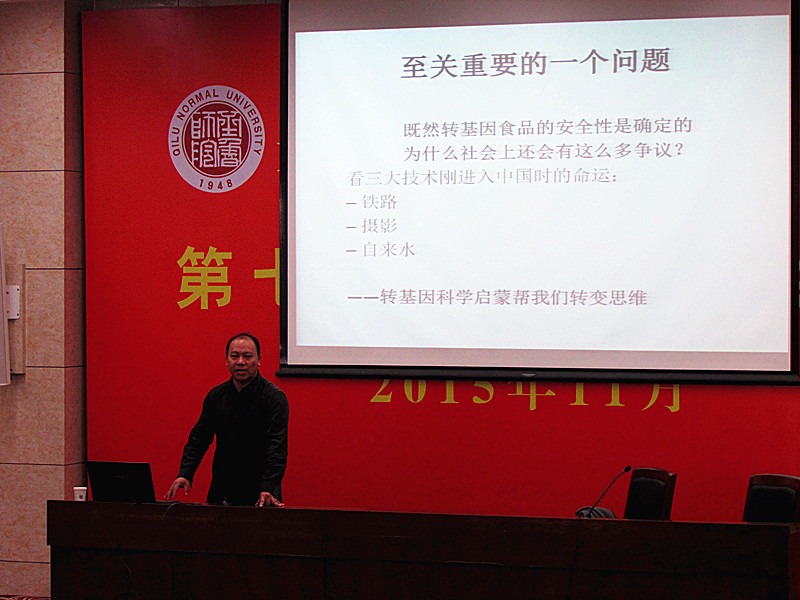 2015年11月26日下午3:30,在学术报告厅举办生命科学学院与中国农科院生物技术研究所共建服务型党组织活动,举行转基因科普宣传系列讲座之五,邀请到基因农业网主编、高级编辑方玄昌在学术报告厅就“转基因:历程、责任和对策”做学术报告,由中国农科院生物技术研究所第一党支部张兰书记陪同,由我院党总支书记于惠敏教授主持。