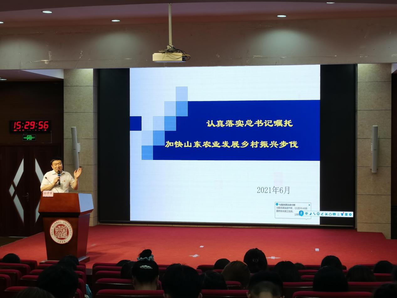 孙学军在我校学术报告厅作了《认真落实总书记嘱托加快山东农业发展乡村振兴步伐》的专题报告。从山东省现代农业发展现状、推进农业农村经济工作的总体思路和重点任务、当前农业农村经济发展的形势任务三个方面展开报告,系统阐述了山东省现代农业在生产、产能、加工以及市场上的发展现状;深刻阐明了山东省现代农业今后发展的三大亮点:一是建“三区”“三园”加“一体”,二是大规模实施农业节水,三是扶持乡村工匠,旨在加快推进农业和农村现代化。