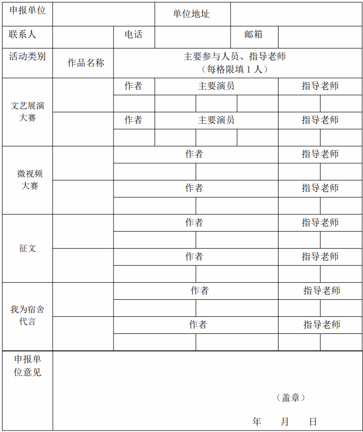①各学院需填写《公寓文化活动评选申报表》(见附件一),与参评作品电子版一同提交。