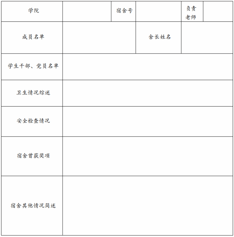 3.评选要求及注意事项:文明宿舍评选需满足宿舍成员学年内无违反公寓管理规定和其他校规校纪的要求,宿舍初评将重点结合学生宿舍的日常安全检查和宿舍舍员遵守校规校纪。参与文明评选的宿舍需由各学院于 11 月 11 日前在本学院范围内对文明宿舍进行初评和推荐上报。经过初评推选出的宿舍,填写《文明宿舍申报审核表》(见附件四)并于 11 月 13 日前电子版交至学生管理中心邮箱 qlsfxsgy@163.com。11 月 18 日起将开展对推荐上报宿舍的校级检查评选工作,每个宿舍发放锦旗一面。