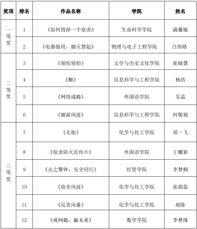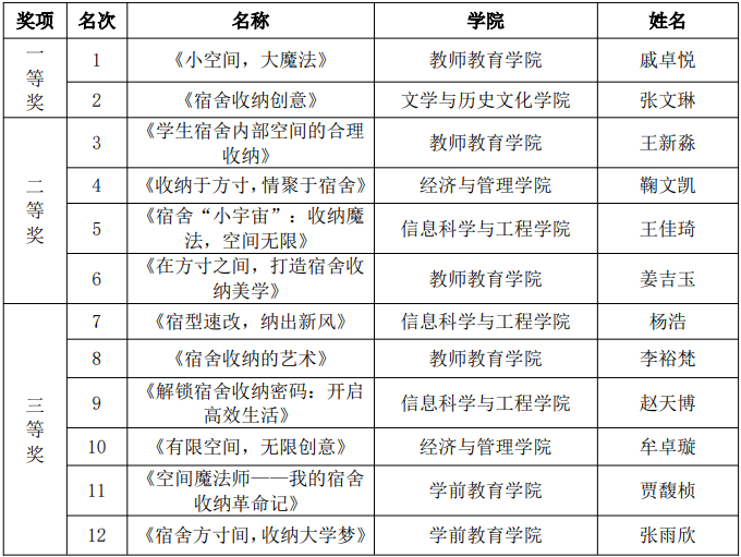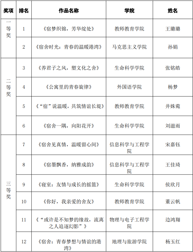 为落实立德树人根本任务,全面提升我校学生公寓文化建设水平和育人质量,我校举办第十二届大学生宿舍文化节,全校师生积极参与,充分展现了丰富多彩的宿舍生活和团结友爱的精神风貌。经评审,获奖名单如下: