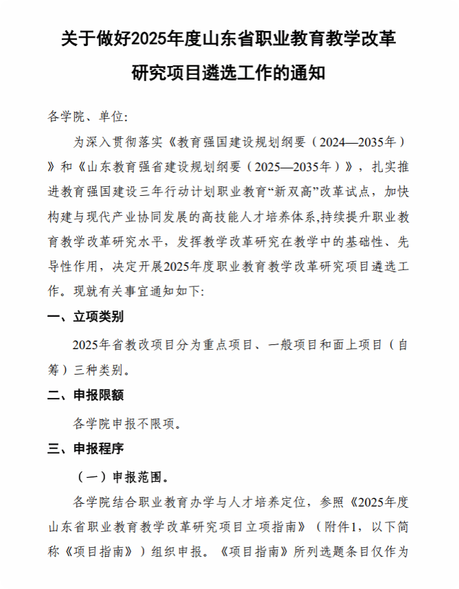 关于做好2025年度山东省职业教育教学改革研究项目遴选工作的通知