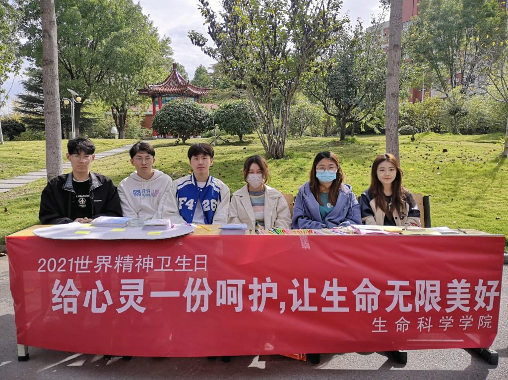 10月10日是世界精神卫生日,今年的主题是“青春之心灵,青春之少年”。生命科学学院为响应第30个世界精神卫生日的号召,2021年10月10日上午9:30,在第一餐厅前开展了主题为“给心灵一份呵护,让生命无限美好”的2021世界精神卫生日宣传教育活动,加强了师院学子们对精神卫生的重要性和迫切性的认识,共同创造有利于青少年心理健康的外部环境。