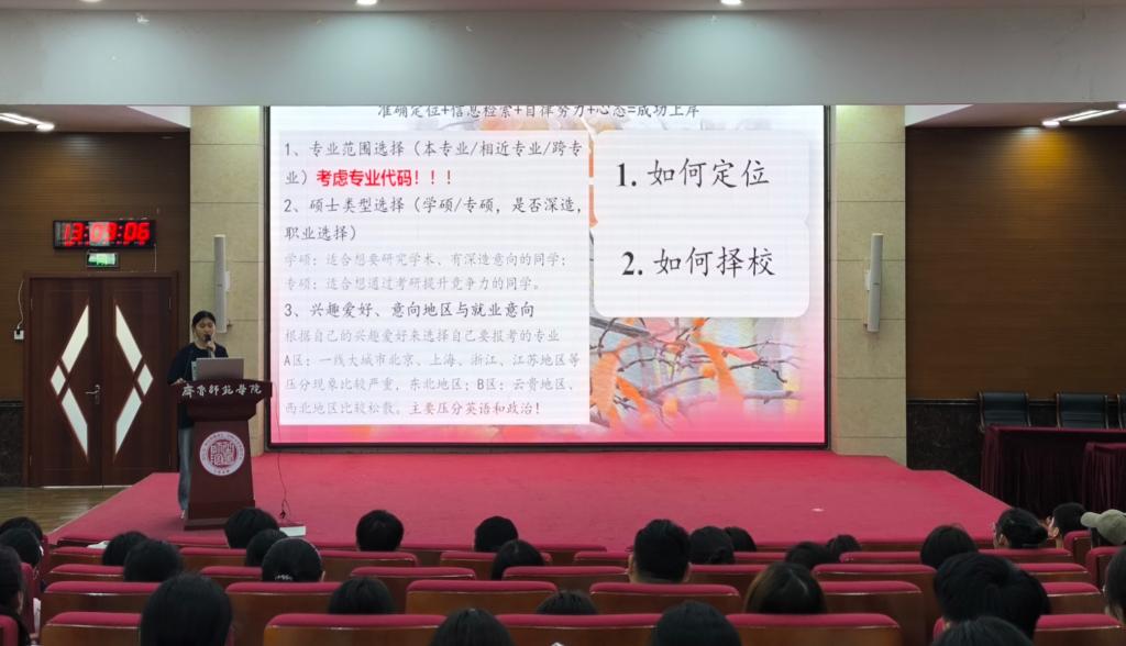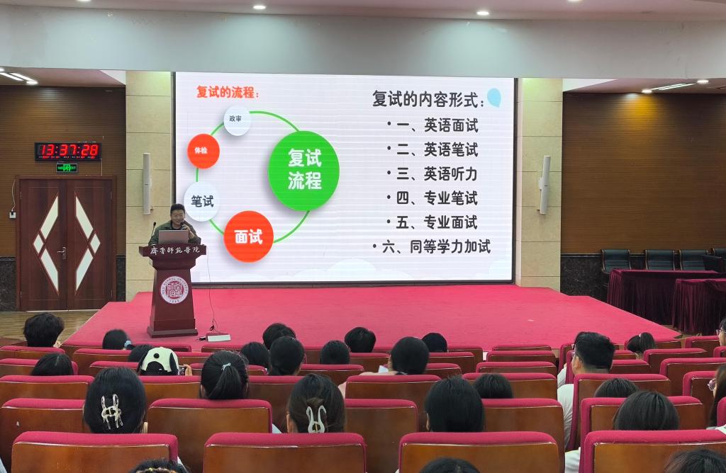 随后,2025届优秀毕业生代表分享考研经验。赵倩、程延烁两位同学结合自身经验,从院校选择、学习平台、复习规划和应试技巧等方面进行了详细讲解。两位学长学姐的分享赢得了现场阵阵掌声,互动环节中,学生们踊跃提问,气氛热烈。