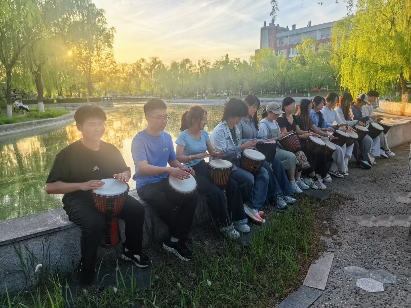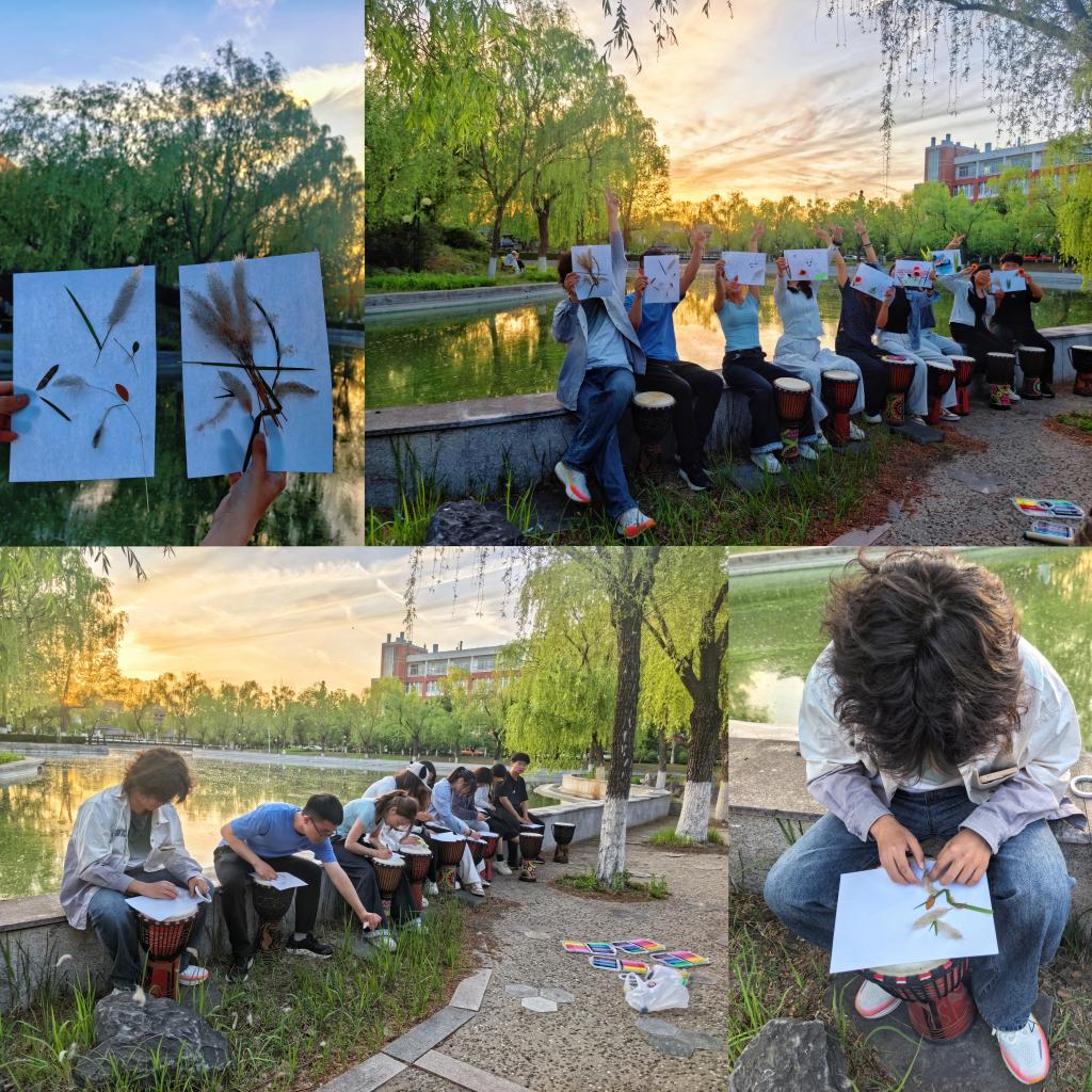 活动通过非洲鼓的原生态节奏与自然音效交织,学生们在敲击与弹奏中感受生命的律动。活动中,学生们录制风声、水流声等自然声音,创作出独特的“自然交响曲”。通过音乐即兴表达情绪,有的用急促鼓点释放焦虑,有的用舒缓旋律传递平静。一位同学感叹:“原来自然的声音如此治愈,音乐让我敢于直面内心的烦恼。”