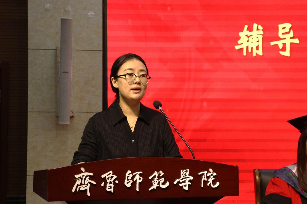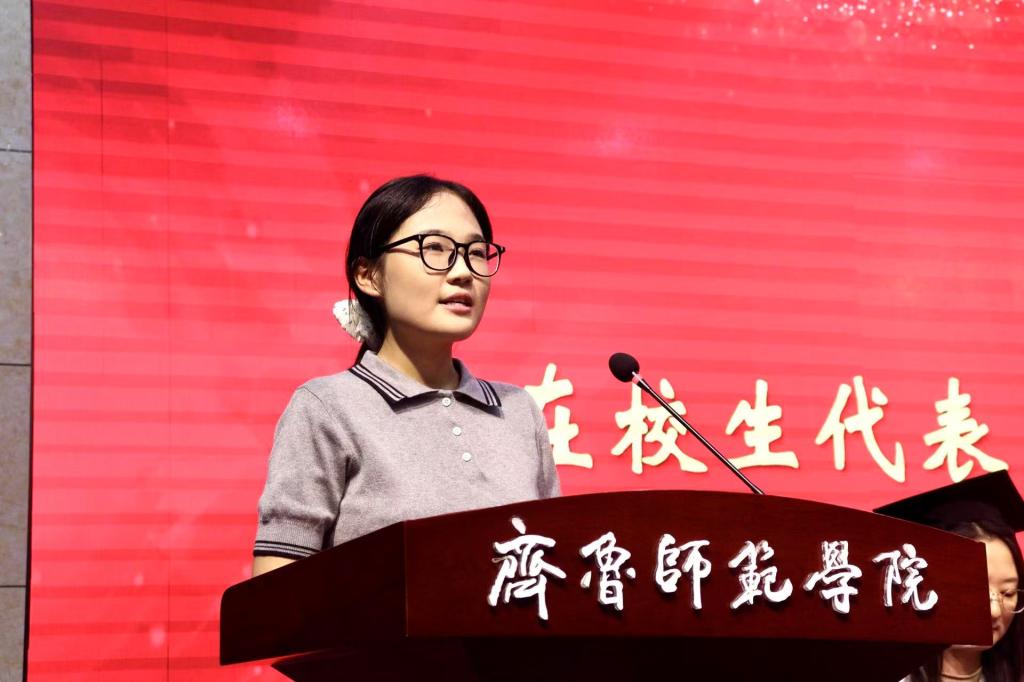 毕业生代表刘焱进行发言,她代表全体毕业生表达了对母校、学院和师长的深切感恩与不舍,回望在母校的成长与收获,她表示“博学明道、崇德向贤”的校训与“厚德厚行、求真求实”的院训早已内化为立身准则,指引我们知行合一、求真实干,她以自身加入“西部计划”为例,号召青年学子们,要肩负时代使命,在中华民族伟大复兴的征程中贡献青春和力量。