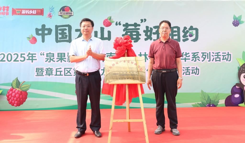 6 月 28 日上午,“泉果飘香” 首届济南特色林果嘉年华系列活动之第六届章丘龙山树莓文化旅游节在章丘区龙山莓园隆重举行。党委副书记、校长郑秀文受邀出席开幕式,并与当地政府、企业共同推进山东省树莓产业发展研究院签约授牌等多项议程。山东农技协理事长、省科协原副主席、一级巡视员陈爱国,山东省经济林协会会长赵之峰,济南市科学技术协会党组书记、副主席贾文涛,章丘区委常委、副区长许芳等出席活动。活动由章丘区龙山街道办事处主任杨玉新主持。龙山街道党工委书记于亮在活动致辞中对各位嘉宾的到来表示热烈欢迎。山东省章丘龙翔树莓生物科技有限公司(以下简称龙翔树莓)总经理窦广磊详细介绍了树莓产业相关情况,对树莓的营养价值、产业发展成果及未来规划进行了详细阐述。随后,陈爱国与贾文涛为龙山树莓国家级科技小院揭牌,标志着树莓产业在科技研发与人才培养方面将迈向新台阶。郑秀文与赵之峰为山东省树莓产业发展研究院揭牌,标志着校地企协同推进树莓产业发展开启崭新篇章。郑秀文感谢各位领导、专家、章丘区政府及企业对我院发展给予的支持和帮助。他指出,2024年4月,我院作为第一共建单位与龙翔树莓共建的“山东章丘树莓科技小院”获批国家级科技小院,有效推动了科技与地方的深度融合。研究院的成立是校地企协同创新的又一重要举措,也是各方资源优势互补的必然选择。我院将充分发挥自身在科研创新和人才培养方面的优势,整合校内外优质资源,为研究院的建设与发展提供全方位支持,全力推动山东省树莓产业向专业化、规模化迈进,助力乡村振兴和区域经济高质量发展。