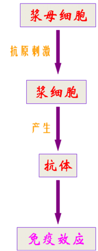 被特异性抗原激活的B细胞被活化后,转化为浆母细胞,再增殖、分化为浆细胞,分泌抗体。