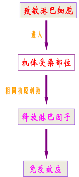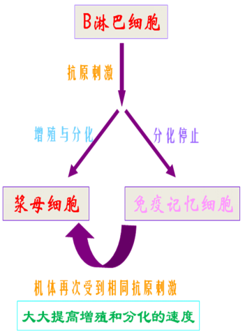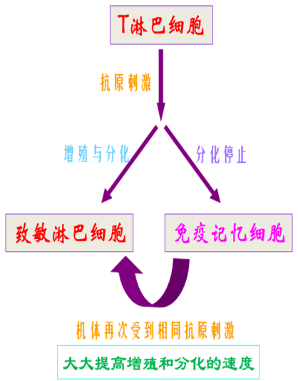 受抗原刺激的淋巴细胞,在分化过程中,还有一部分细胞在中途停顿下来,不再增殖分化,成为记忆细胞,在体内能较长时间存在。当再次受到同种抗原刺激时,能迅速分化增殖成大量致敏淋巴细胞和浆细胞,分别产生大量淋巴因子及抗体。