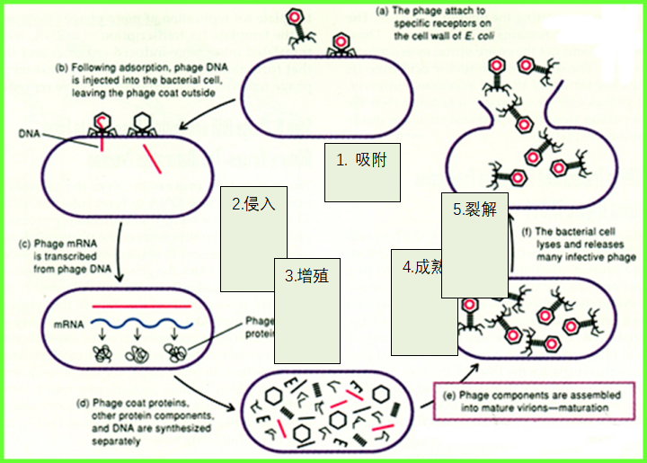 以大肠杆菌的病毒——T偶数噬菌体为例,其增殖过程分为吸附、侵入、增殖 (核酸的复制与蛋白质生物合成)、成熟 (装配) 、裂解(释放)五个阶段。